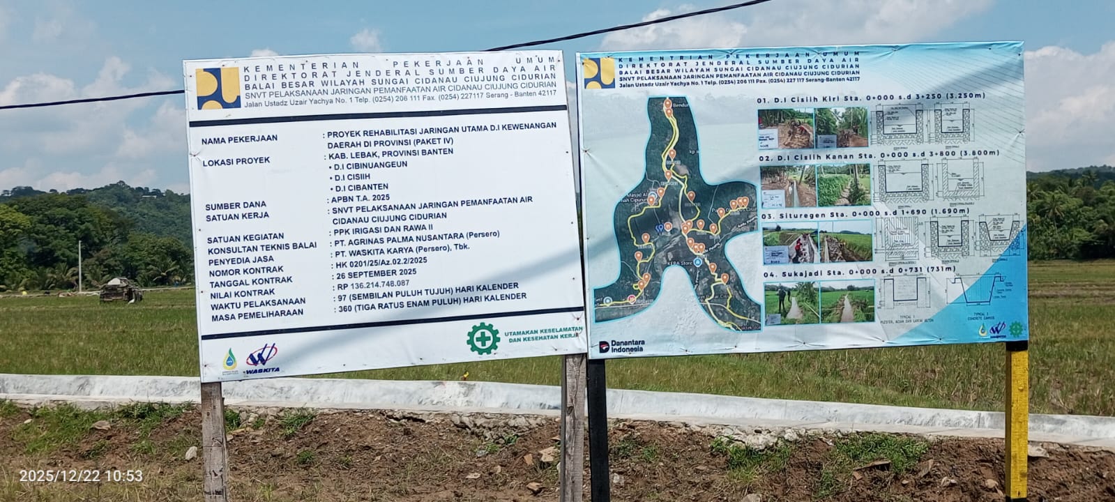 Berdasarkan papan informasi di lokasi, proyek ini merupakan bagian dari Rehabilitasi Jaringan Irigasi APBN Tahun 2025 di bawah naungan Balai Besar Wilayah Sungai Cidanau, Ciujung, Cidurian (BBWSC3), Kementerian Pekerjaan Umum.