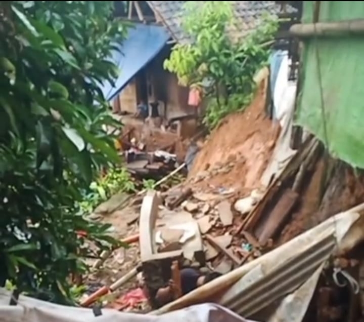 Caption:kondisi rumah yang hampir longsor(Didin CNO)Lebak,CNO – Akibat intensitas hujan yang cukup tinggi, beberapa rumah di kampung Sukajaya Rt 3/1 , desa Bayah Timur, kecamatan Bayah, kabupaten Lebak, Provinsi Banten, bagian teras dan halaman rumahnya longsor, Minggu, 11/01/26.